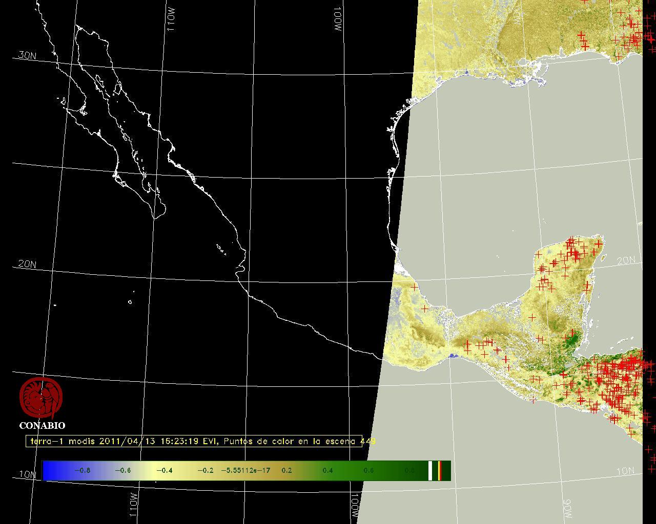 Se considera como punto de calor al elemento espacial mínimo de la imagen (pixel) que reporta una temperatura elevada. Para las imágenes diurnas la temperatura mínima considera es de 42 C y para las imágenes nocturnas es de 25 C. |