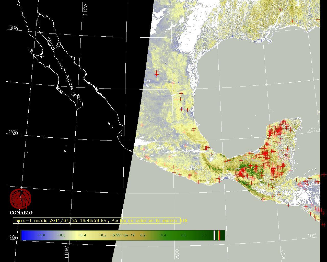 Se considera como punto de calor al elemento espacial mínimo de la imagen (pixel) que reporta una temperatura elevada. Para las imágenes diurnas la temperatura mínima considera es de 42 C y para las imágenes nocturnas es de 25 C. |