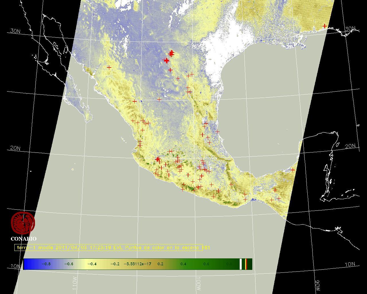 Se considera como punto de calor al elemento espacial mínimo de la imagen (pixel) que reporta una temperatura elevada. Para las imágenes diurnas la temperatura mínima considera es de 42 C y para las imágenes nocturnas es de 25 C. |
