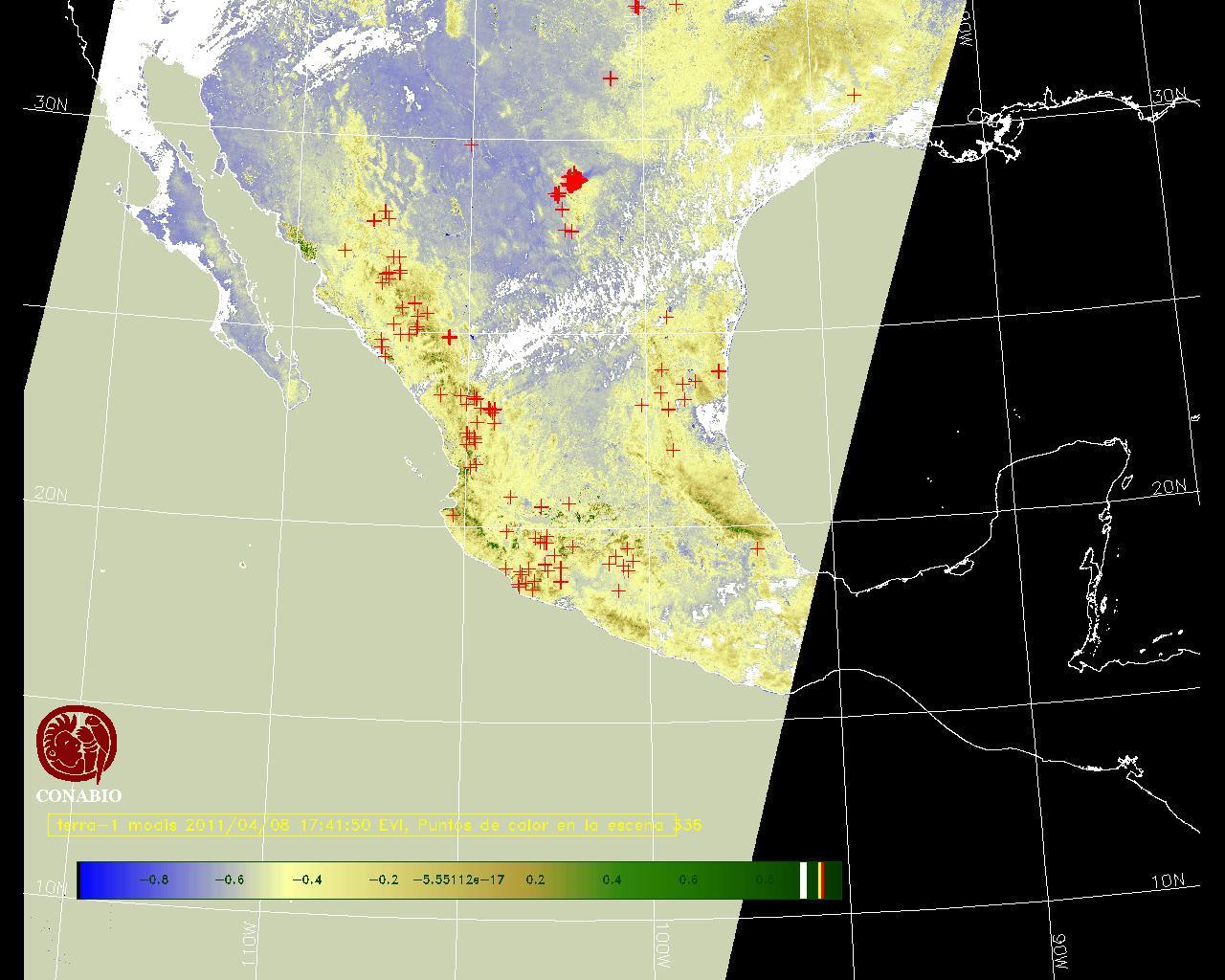 Se considera como punto de calor al elemento espacial mínimo de la imagen (pixel) que reporta una temperatura elevada. Para las imágenes diurnas la temperatura mínima considera es de 42 C y para las imágenes nocturnas es de 25 C. |