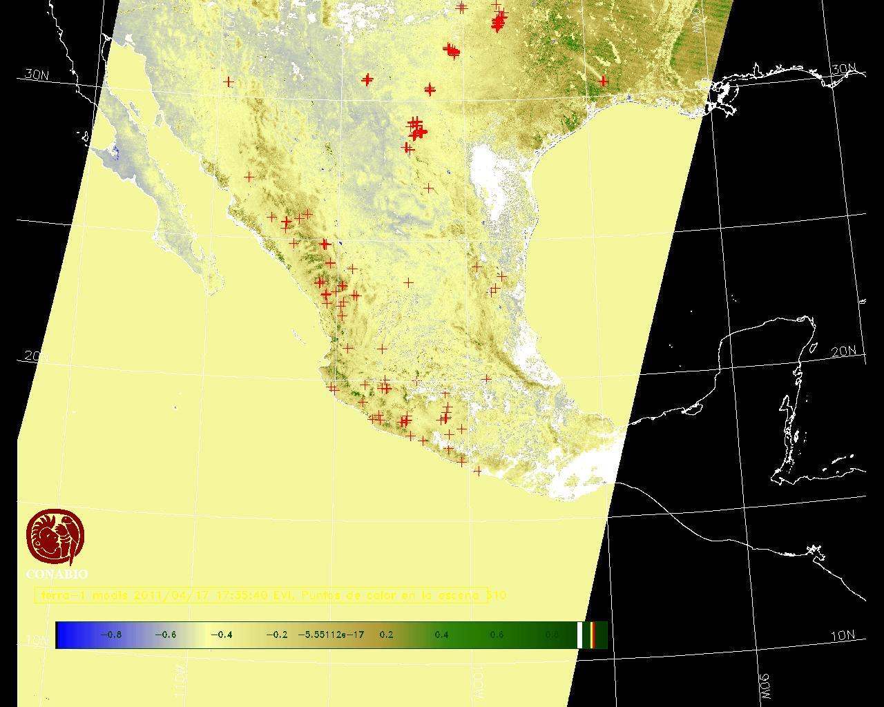 Se considera como punto de calor al elemento espacial mínimo de la imagen (pixel) que reporta una temperatura elevada. Para las imágenes diurnas la temperatura mínima considera es de 42 C y para las imágenes nocturnas es de 25 C. |