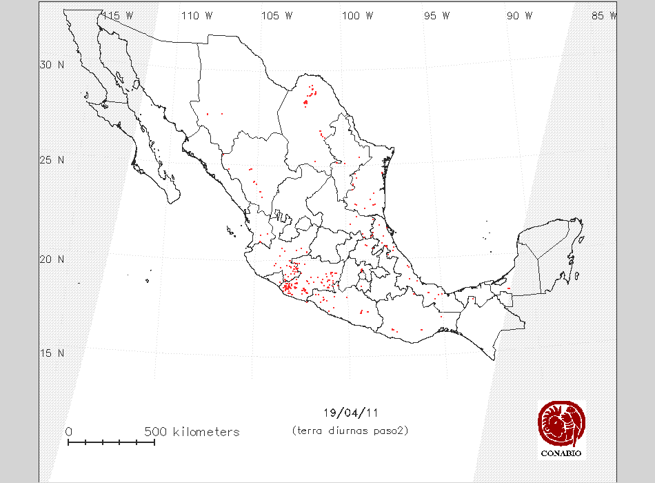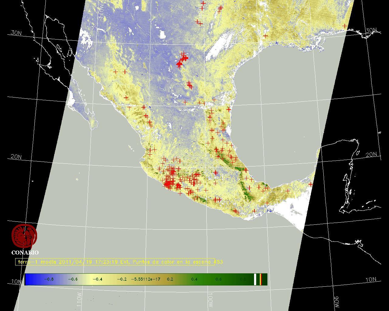 Se considera como punto de calor al elemento espacial mínimo de la imagen (pixel) que reporta una temperatura elevada. Para las imágenes diurnas la temperatura mínima considera es de 42 C y para las imágenes nocturnas es de 25 C. |