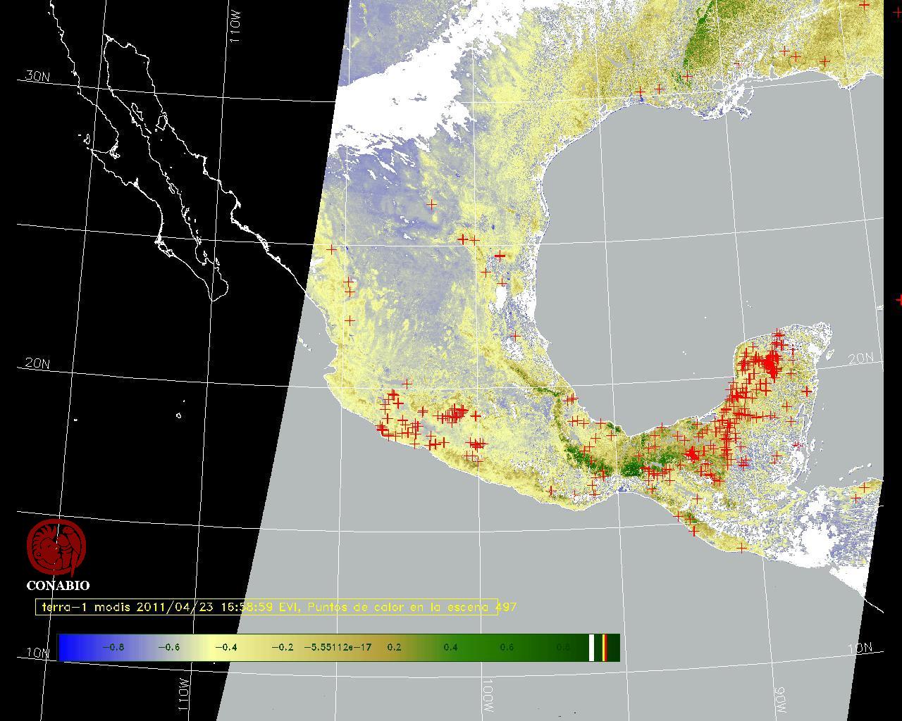 Se considera como punto de calor al elemento espacial mínimo de la imagen (pixel) que reporta una temperatura elevada. Para las imágenes diurnas la temperatura mínima considera es de 42 C y para las imágenes nocturnas es de 25 C. |