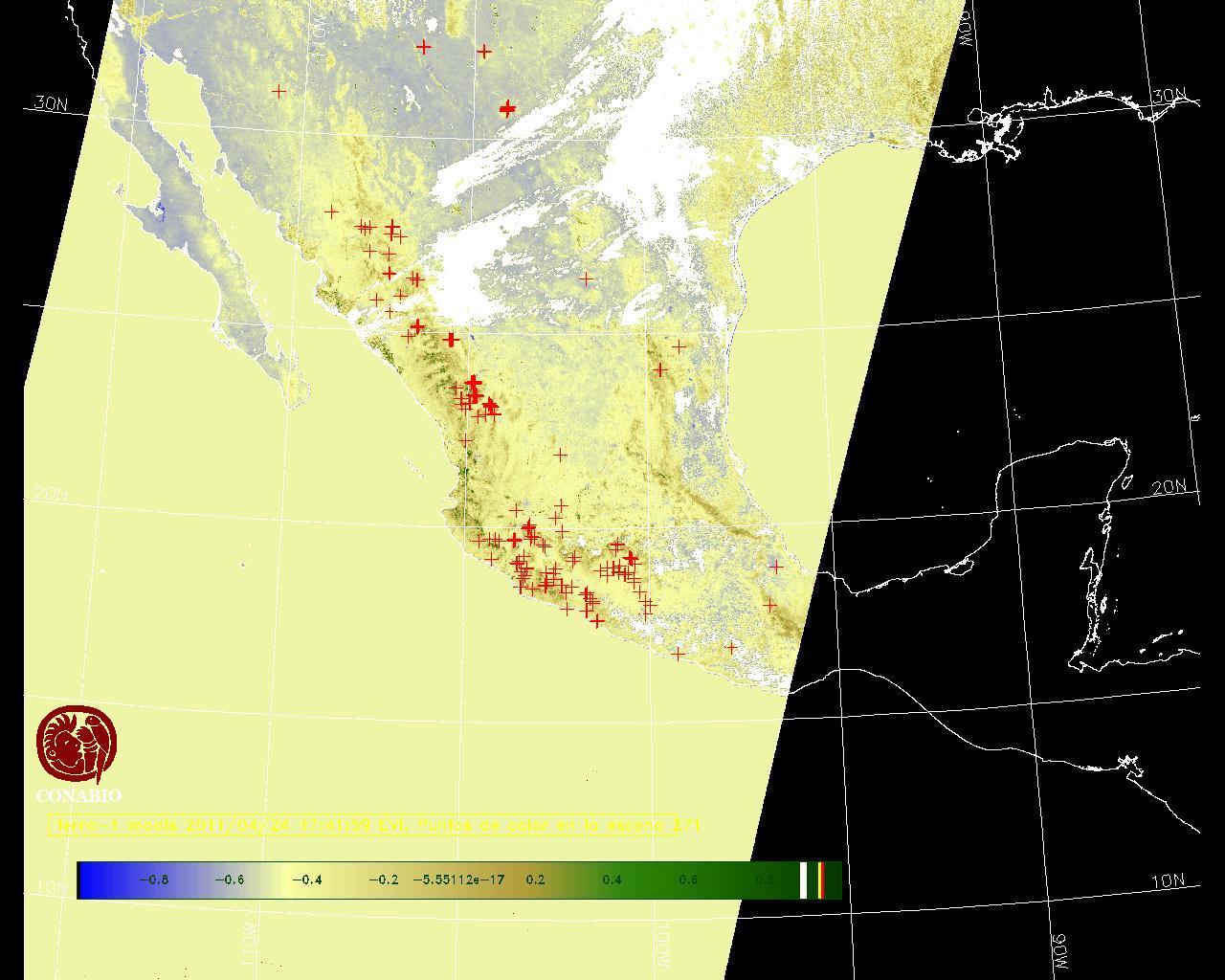 Se considera como punto de calor al elemento espacial mínimo de la imagen (pixel) que reporta una temperatura elevada. Para las imágenes diurnas la temperatura mínima considera es de 42 C y para las imágenes nocturnas es de 25 C. |
