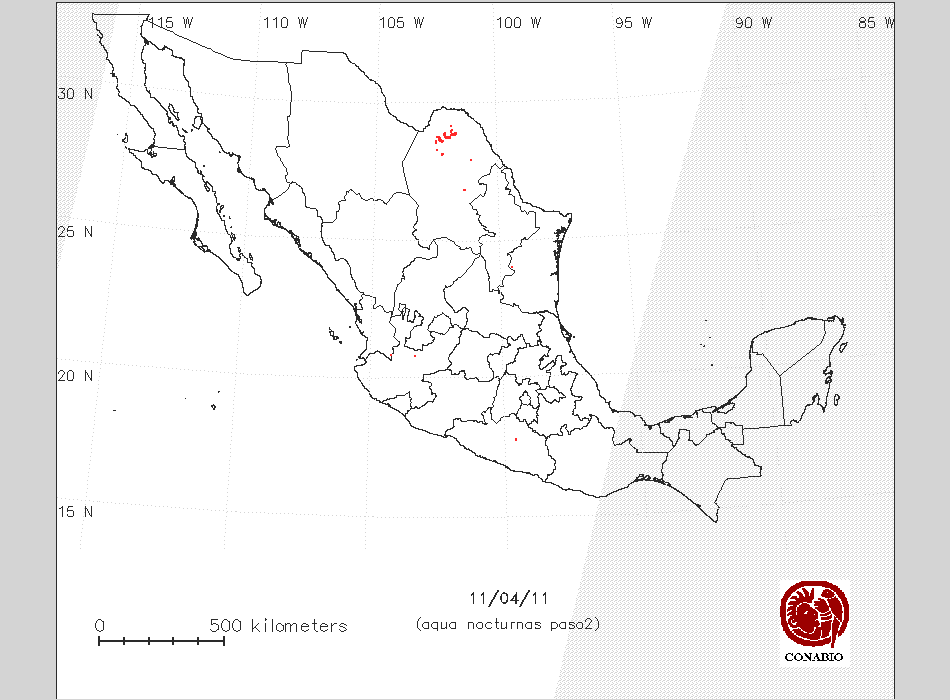 Se considera como punto de calor al elemento espacial mínimo de la imagen (pixel) que reporta una temperatura elevada. Para las imágenes diurnas la temperatura mínima considera es de 42 C y para las imágenes nocturnas es de 25 C. |