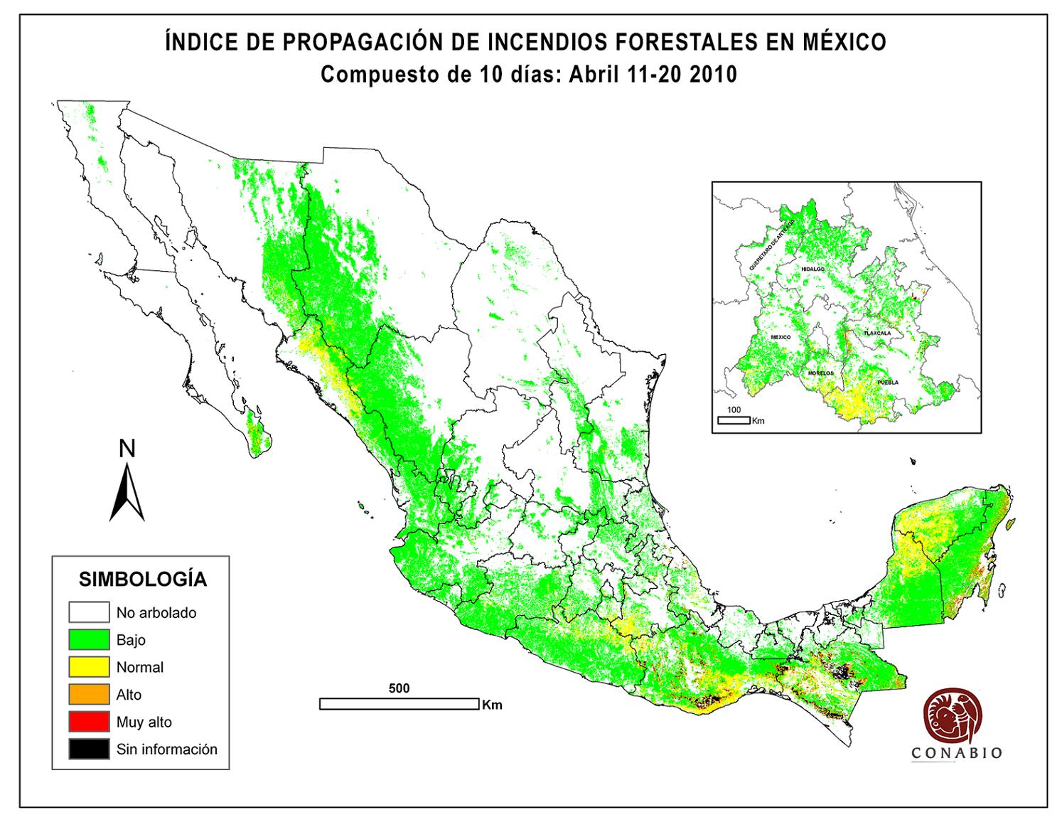 Indica el riesgo de propagación de incendios forestales. Se basa exclusivamente en el vigor de la vegetación, cuanto más seca está la vegetación, más rápido se podrá extender el posible fuego (incendio). Los valores para el índice son: Bajo -> Normal -> Alto -> Muy alto NA (No aplica) se refiere al agua, vegetación no arbolada y los usos de suelo mostrados en gris. ND (No disponible) indica que no hubo información para generar el índice. |