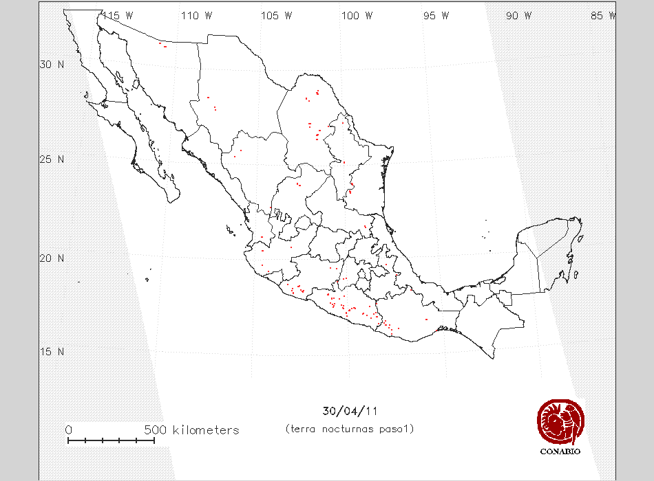 Se considera como punto de calor al elemento espacial mínimo de la imagen (pixel) que reporta una temperatura elevada. Para las imágenes diurnas la temperatura mínima considera es de 42 C y para las imágenes nocturnas es de 25 C. |