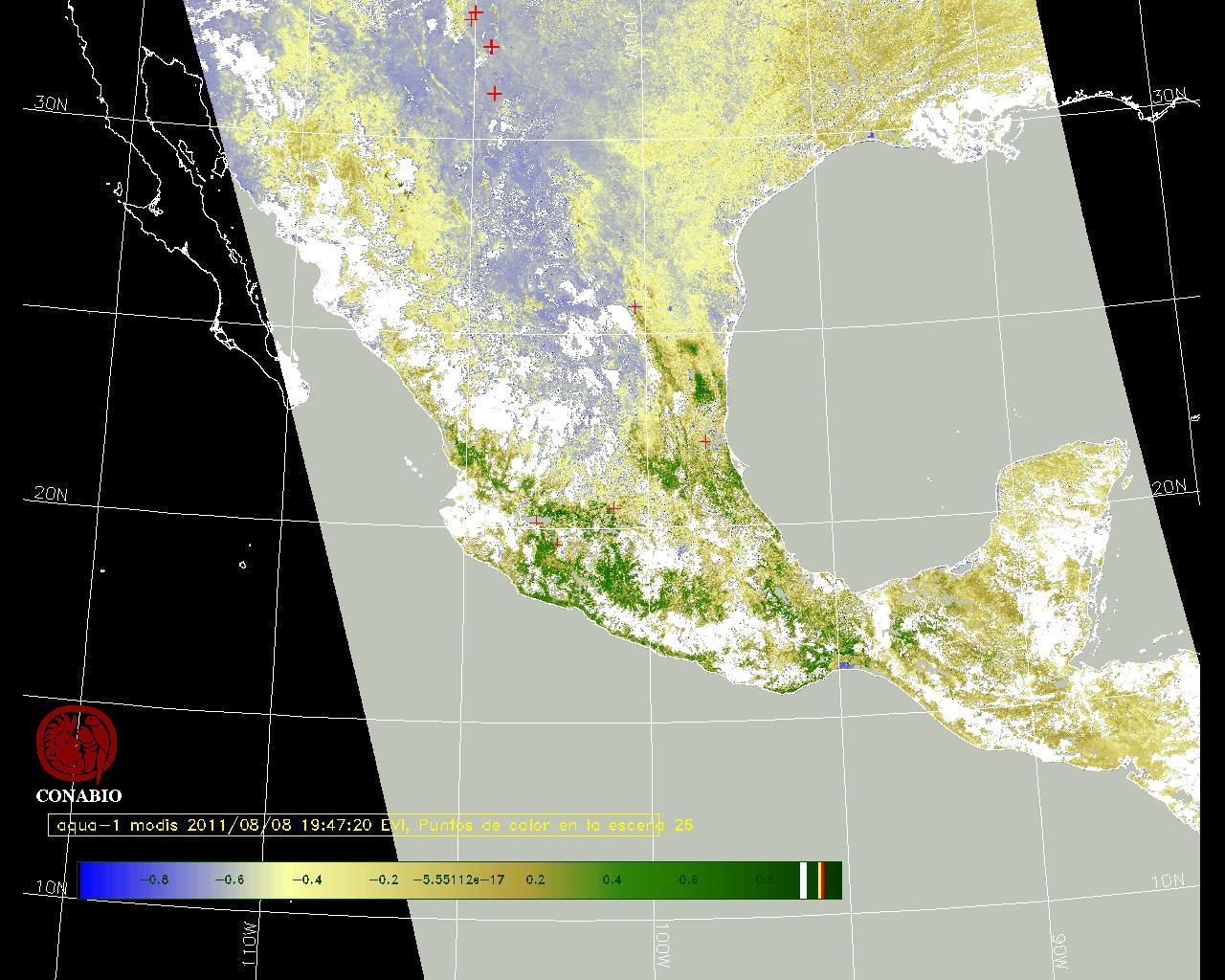Se considera como punto de calor al elemento espacial mínimo de la imagen (pixel) que reporta una temperatura elevada. Para las imágenes diurnas la temperatura mínima considera es de 42 C y para las imágenes nocturnas es de 25 C. |