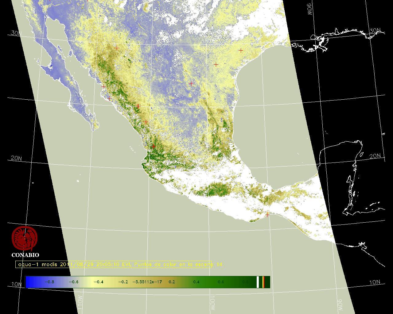 Se considera como punto de calor al elemento espacial mínimo de la imagen (pixel) que reporta una temperatura elevada. Para las imágenes diurnas la temperatura mínima considera es de 42 C y para las imágenes nocturnas es de 25 C. |