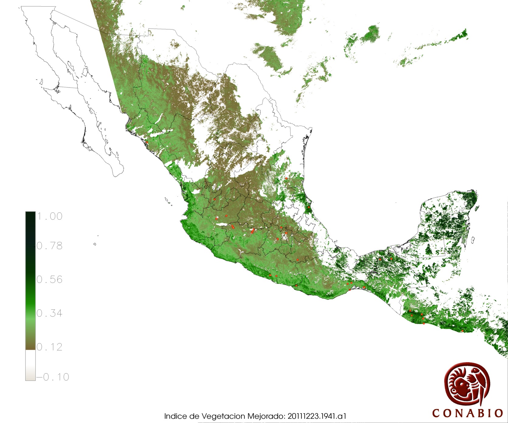 Los valores del índice van de -1 a 1, entre más cercano al valor 1 la vegetación presenta mayor vigor. Los índices de vegetación son utilizados para conocer el comportamiento de la vegetación tanto espacial como temporal. |