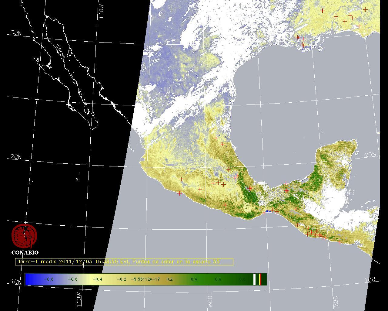 Se considera como punto de calor al elemento espacial mínimo de la imagen (pixel) que reporta una temperatura elevada. Para las imágenes diurnas la temperatura mínima considera es de 42 C y para las imágenes nocturnas es de 25 C. |