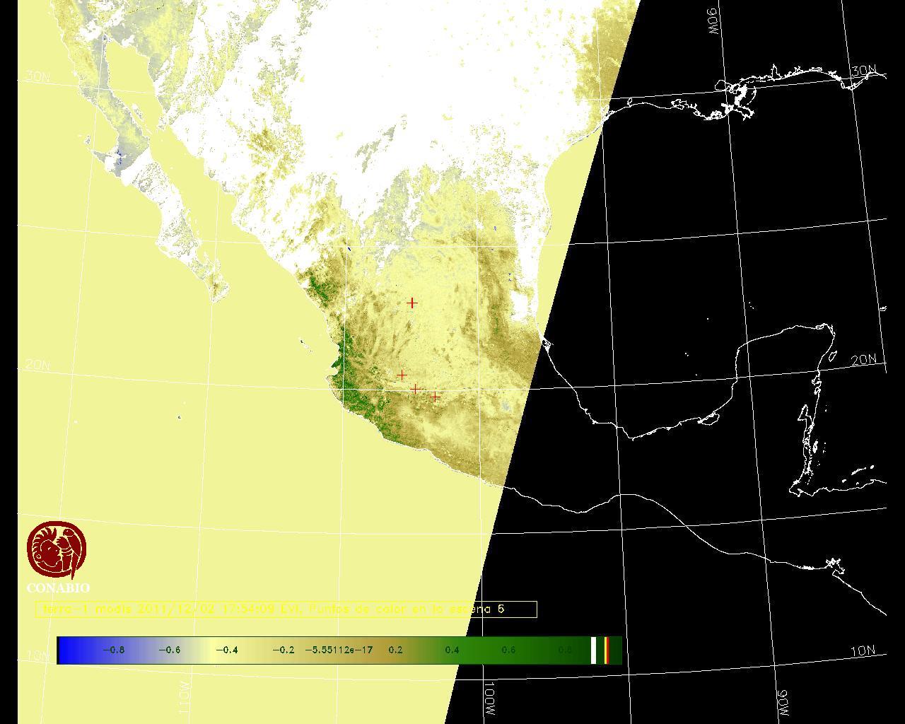 Se considera como punto de calor al elemento espacial mínimo de la imagen (pixel) que reporta una temperatura elevada. Para las imágenes diurnas la temperatura mínima considera es de 42 C y para las imágenes nocturnas es de 25 C. |