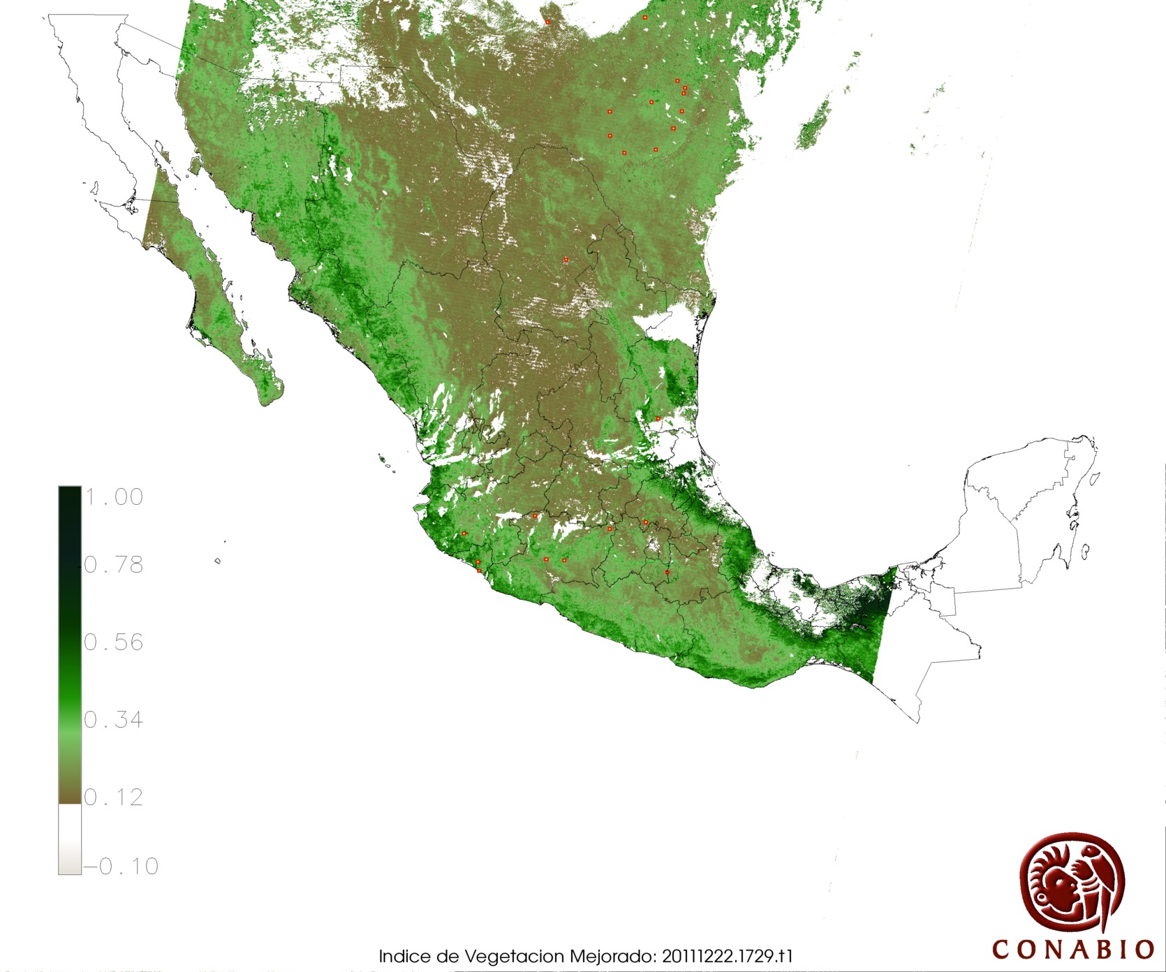 Los valores del índice van de -1 a 1, entre más cercano al valor 1 la vegetación presenta mayor vigor. Los índices de vegetación son utilizados para conocer el comportamiento de la vegetación tanto espacial como temporal. |