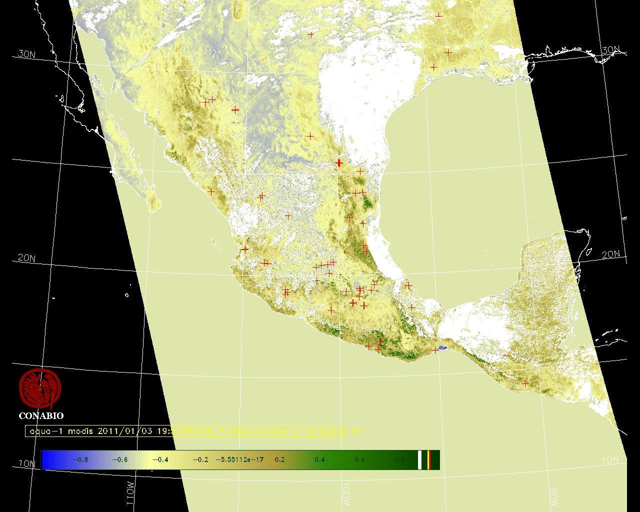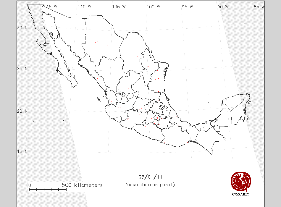 Se considera como punto de calor al elemento espacial mínimo de la imagen (pixel) que reporta una temperatura elevada. Para las imágenes diurnas la temperatura mínima considera es de 42 C y para las imágenes nocturnas es de 25 C. |