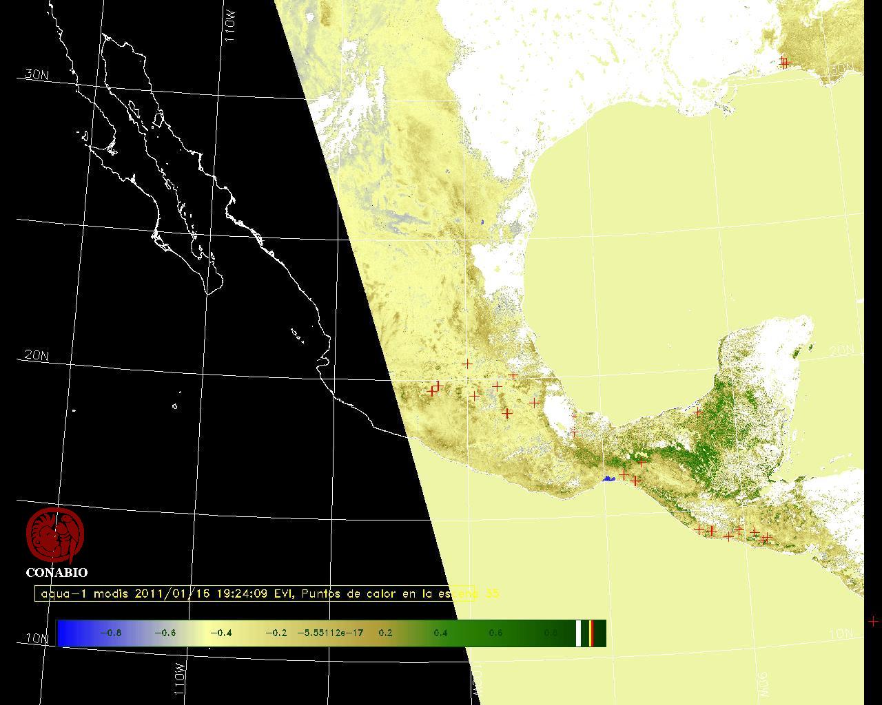 Se considera como punto de calor al elemento espacial mínimo de la imagen (pixel) que reporta una temperatura elevada. Para las imágenes diurnas la temperatura mínima considera es de 42 C y para las imágenes nocturnas es de 25 C. |