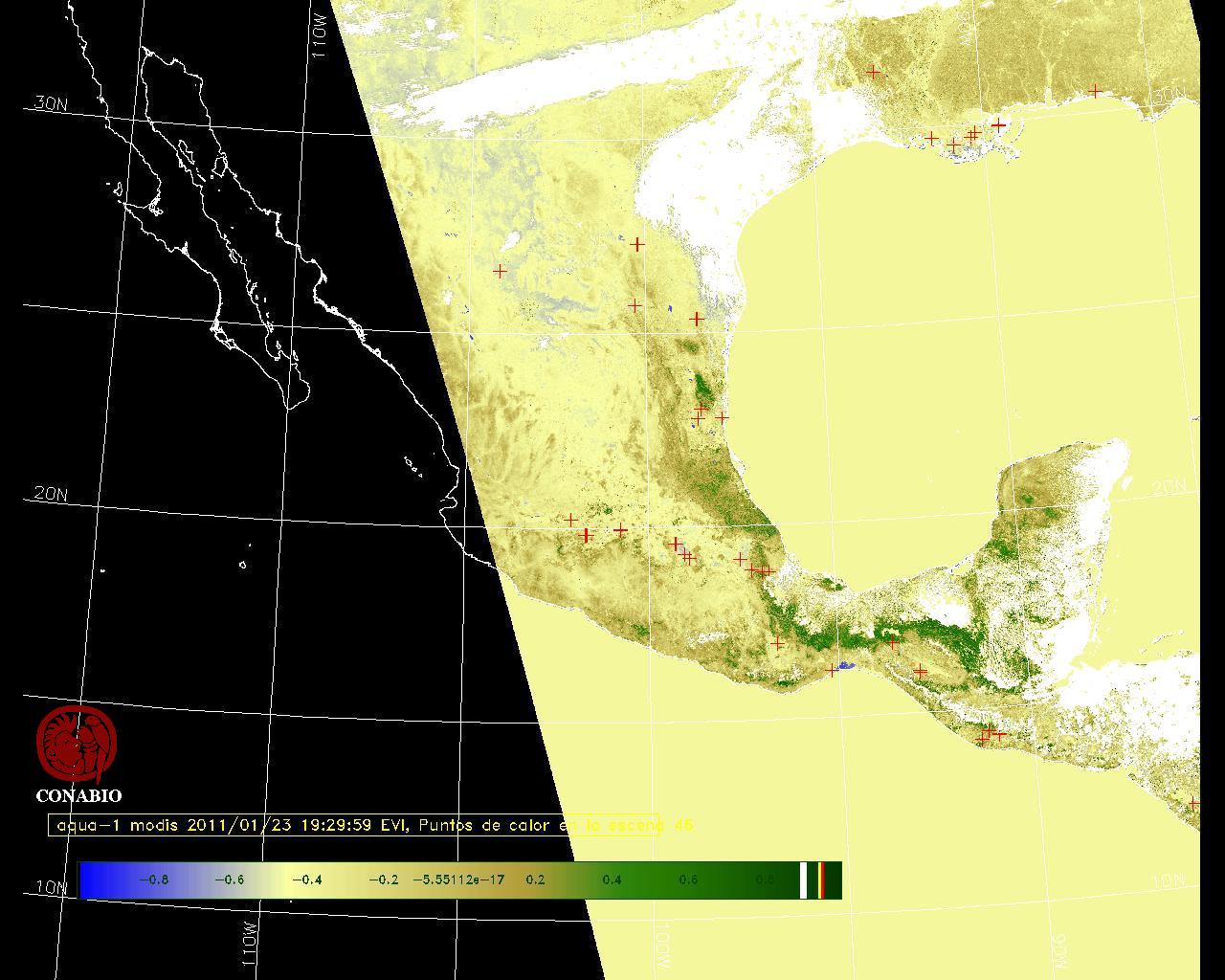 Se considera como punto de calor al elemento espacial mínimo de la imagen (pixel) que reporta una temperatura elevada. Para las imágenes diurnas la temperatura mínima considera es de 42 C y para las imágenes nocturnas es de 25 C. |