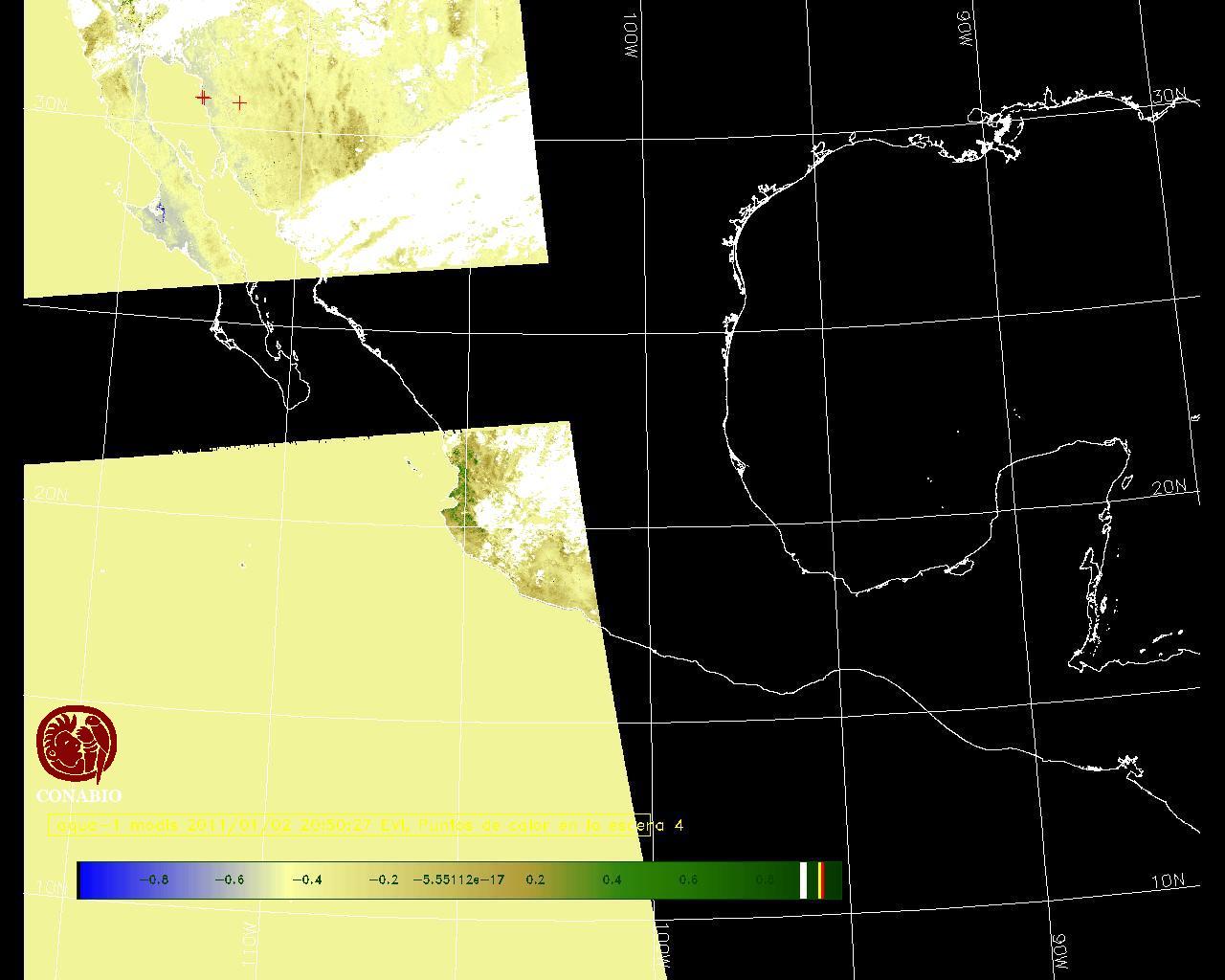 Se considera como punto de calor al elemento espacial mínimo de la imagen (pixel) que reporta una temperatura elevada. Para las imágenes diurnas la temperatura mínima considera es de 42 C y para las imágenes nocturnas es de 25 C. |