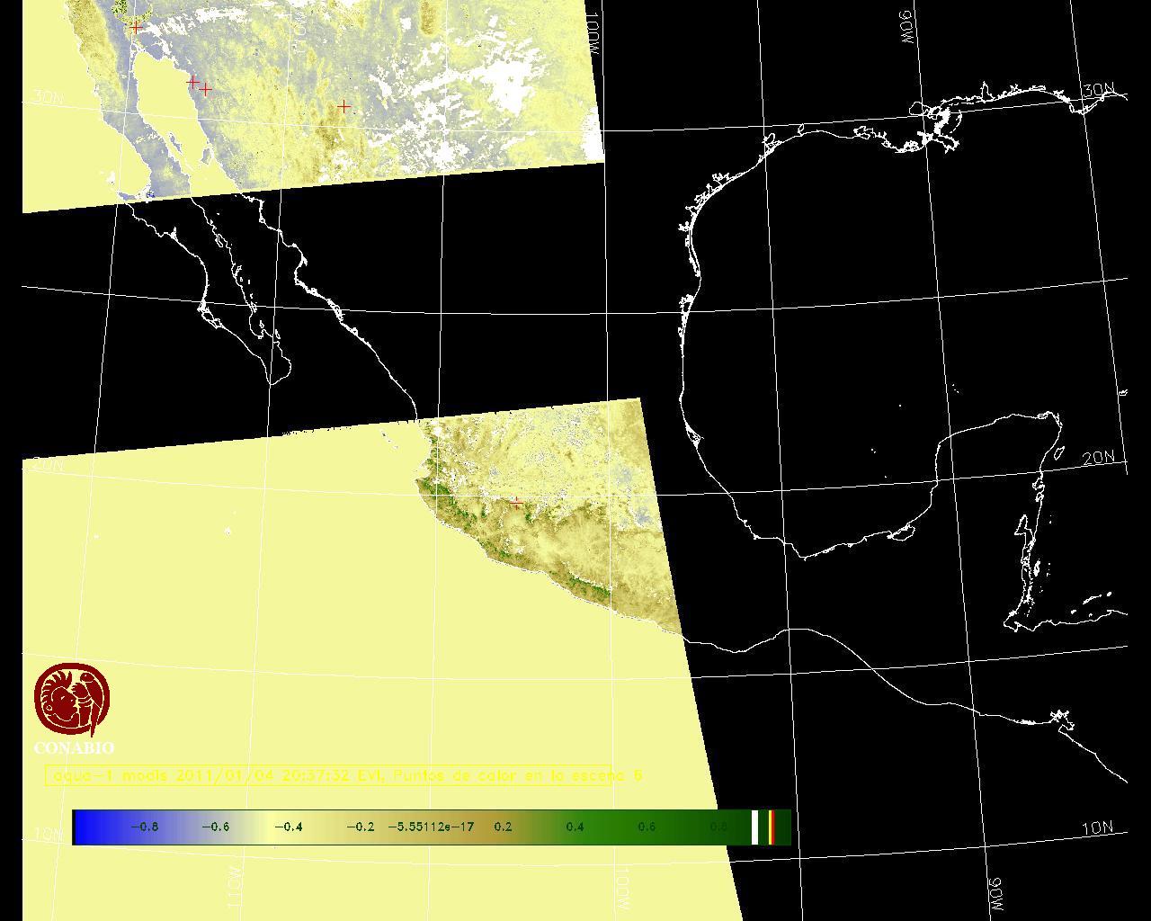 Se considera como punto de calor al elemento espacial mínimo de la imagen (pixel) que reporta una temperatura elevada. Para las imágenes diurnas la temperatura mínima considera es de 42 C y para las imágenes nocturnas es de 25 C. |