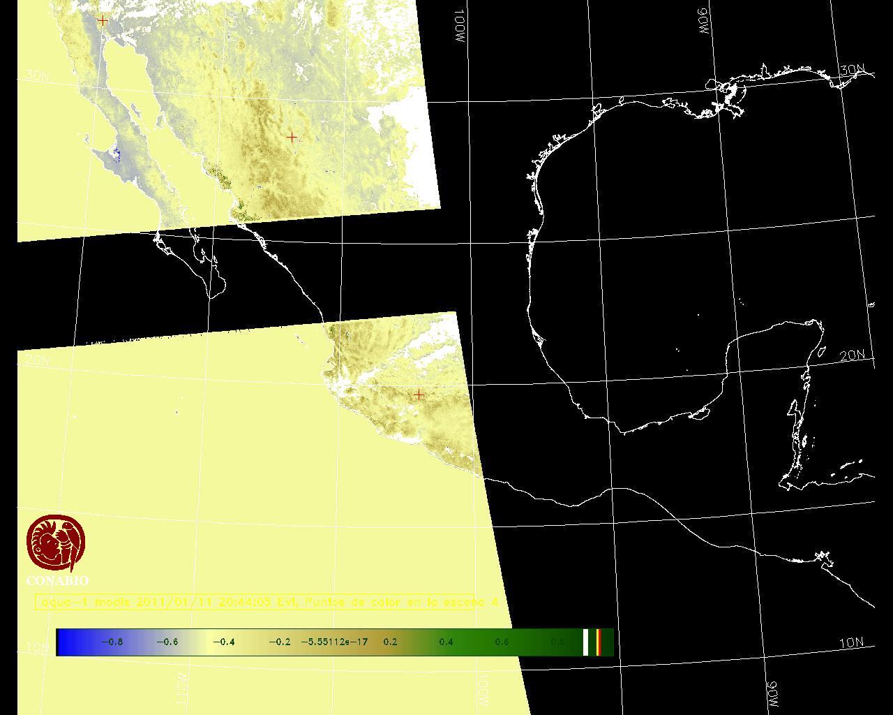 Se considera como punto de calor al elemento espacial mínimo de la imagen (pixel) que reporta una temperatura elevada. Para las imágenes diurnas la temperatura mínima considera es de 42 C y para las imágenes nocturnas es de 25 C. |