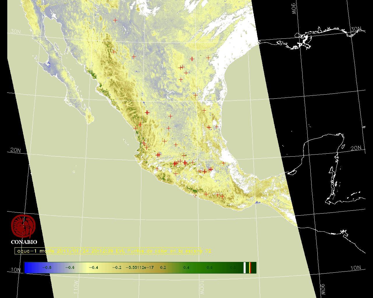 Se considera como punto de calor al elemento espacial mínimo de la imagen (pixel) que reporta una temperatura elevada. Para las imágenes diurnas la temperatura mínima considera es de 42 C y para las imágenes nocturnas es de 25 C. |