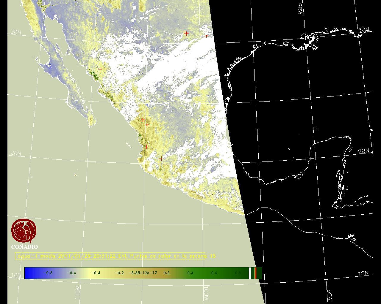 Se considera como punto de calor al elemento espacial mínimo de la imagen (pixel) que reporta una temperatura elevada. Para las imágenes diurnas la temperatura mínima considera es de 42 C y para las imágenes nocturnas es de 25 C. |