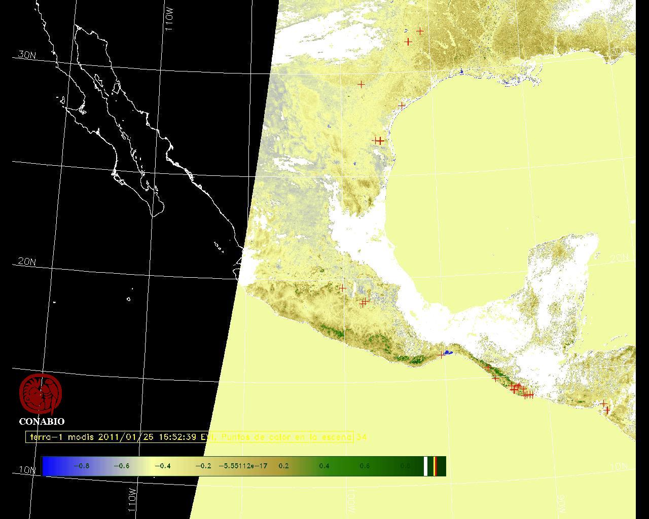 Se considera como punto de calor al elemento espacial mínimo de la imagen (pixel) que reporta una temperatura elevada. Para las imágenes diurnas la temperatura mínima considera es de 42 C y para las imágenes nocturnas es de 25 C. |