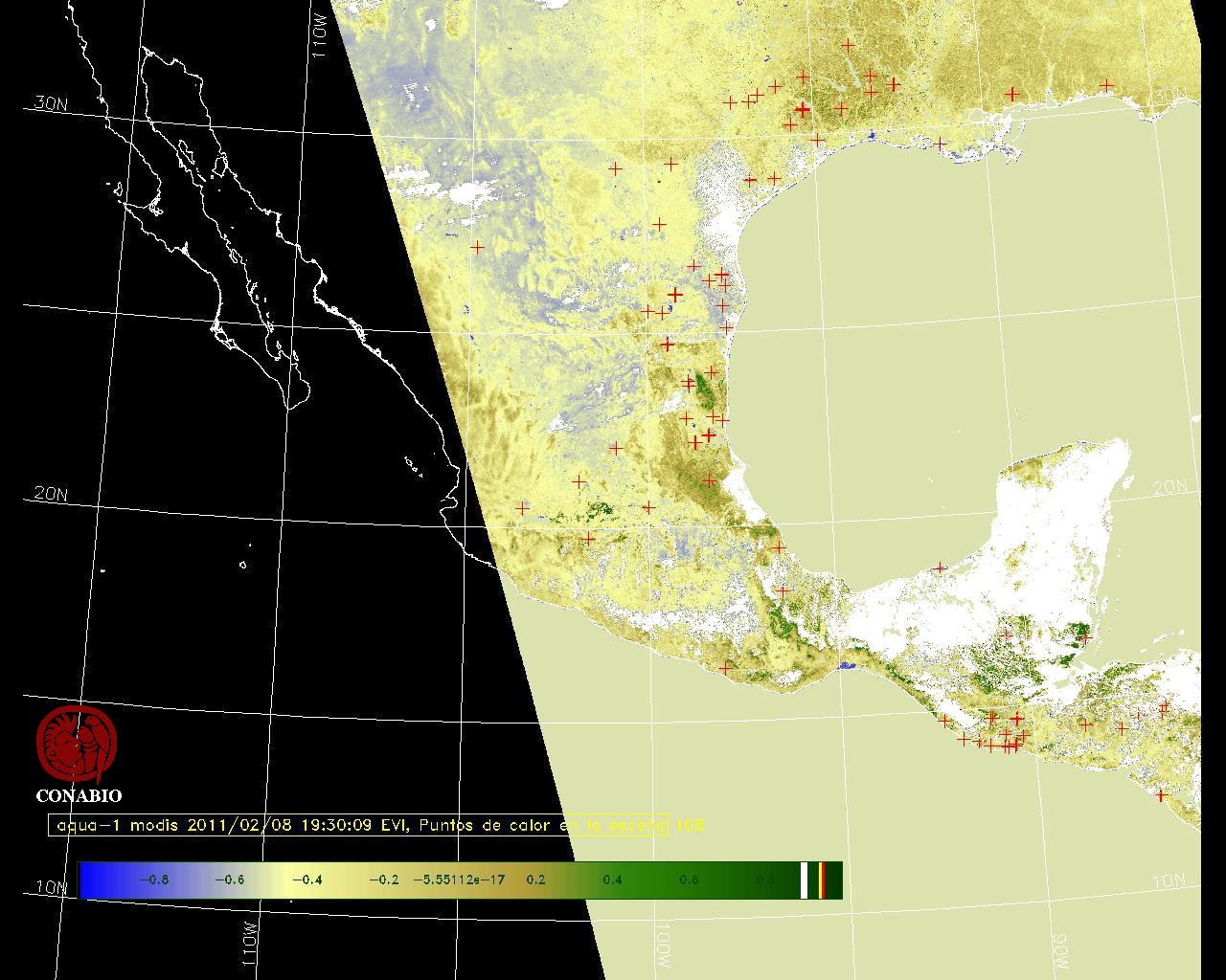 Se considera como punto de calor al elemento espacial mínimo de la imagen (pixel) que reporta una temperatura elevada. Para las imágenes diurnas la temperatura mínima considera es de 42 C y para las imágenes nocturnas es de 25 C. |