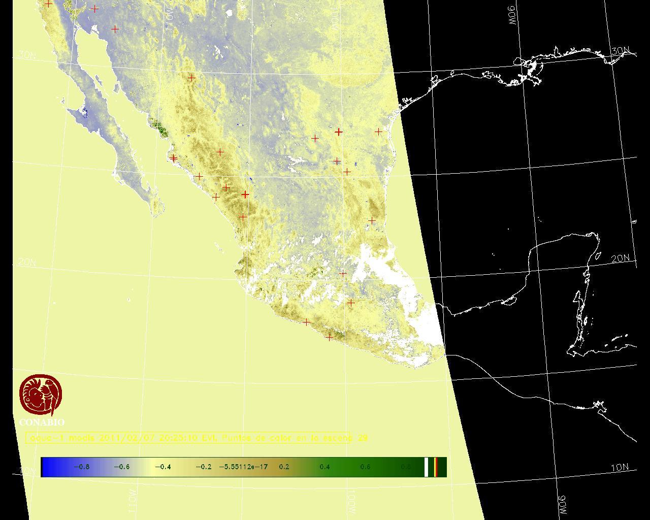 Se considera como punto de calor al elemento espacial mínimo de la imagen (pixel) que reporta una temperatura elevada. Para las imágenes diurnas la temperatura mínima considera es de 42 C y para las imágenes nocturnas es de 25 C. |