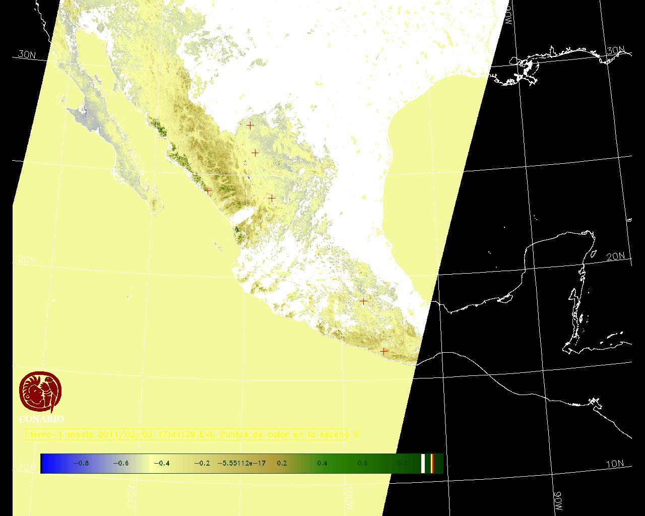 Se considera como punto de calor al elemento espacial mínimo de la imagen (pixel) que reporta una temperatura elevada. Para las imágenes diurnas la temperatura mínima considera es de 42 C y para las imágenes nocturnas es de 25 C. |