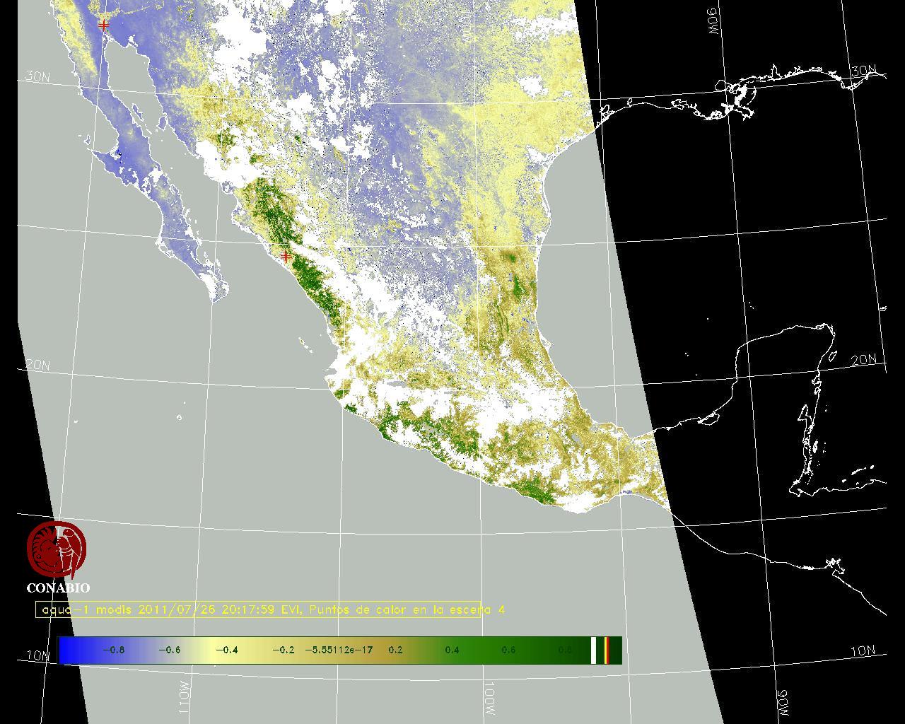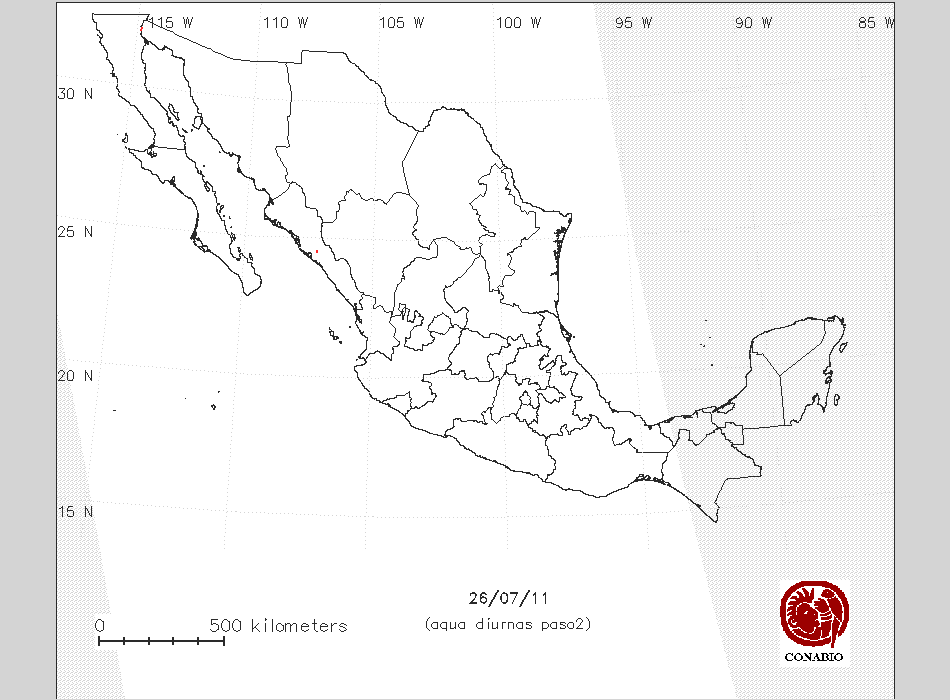 Se considera como punto de calor al elemento espacial mínimo de la imagen (pixel) que reporta una temperatura elevada. Para las imágenes diurnas la temperatura mínima considera es de 42 C y para las imágenes nocturnas es de 25 C. |