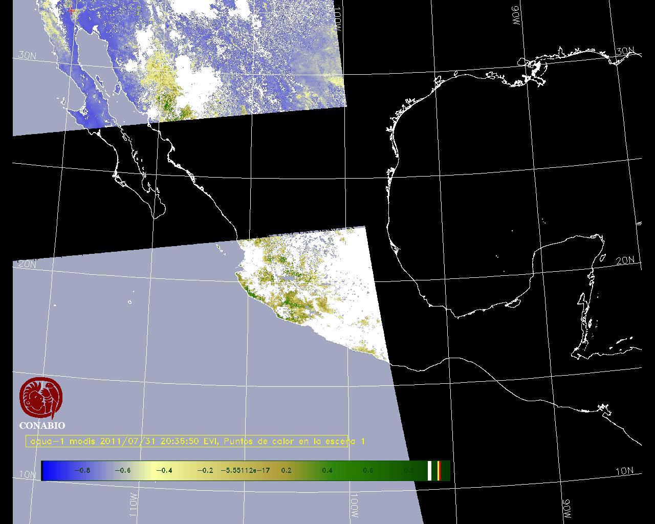 Se considera como punto de calor al elemento espacial mínimo de la imagen (pixel) que reporta una temperatura elevada. Para las imágenes diurnas la temperatura mínima considera es de 42 C y para las imágenes nocturnas es de 25 C. |