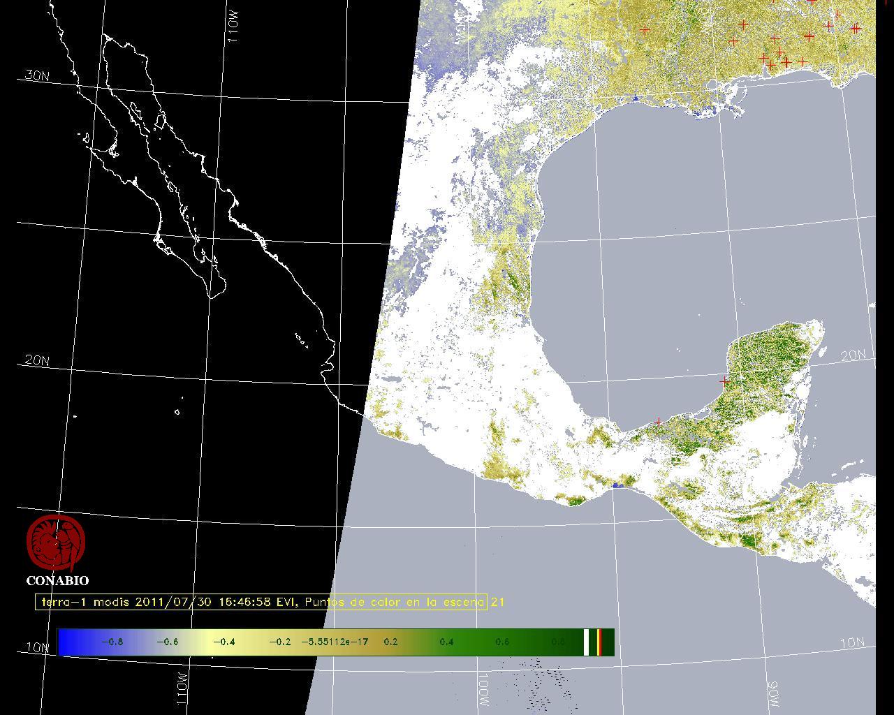 Se considera como punto de calor al elemento espacial mínimo de la imagen (pixel) que reporta una temperatura elevada. Para las imágenes diurnas la temperatura mínima considera es de 42 C y para las imágenes nocturnas es de 25 C. |
