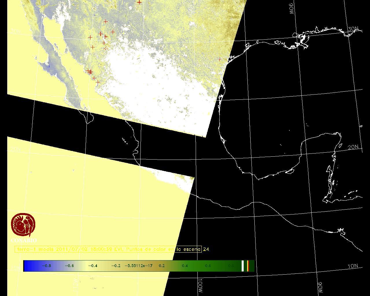 Se considera como punto de calor al elemento espacial mínimo de la imagen (pixel) que reporta una temperatura elevada. Para las imágenes diurnas la temperatura mínima considera es de 42 C y para las imágenes nocturnas es de 25 C. |