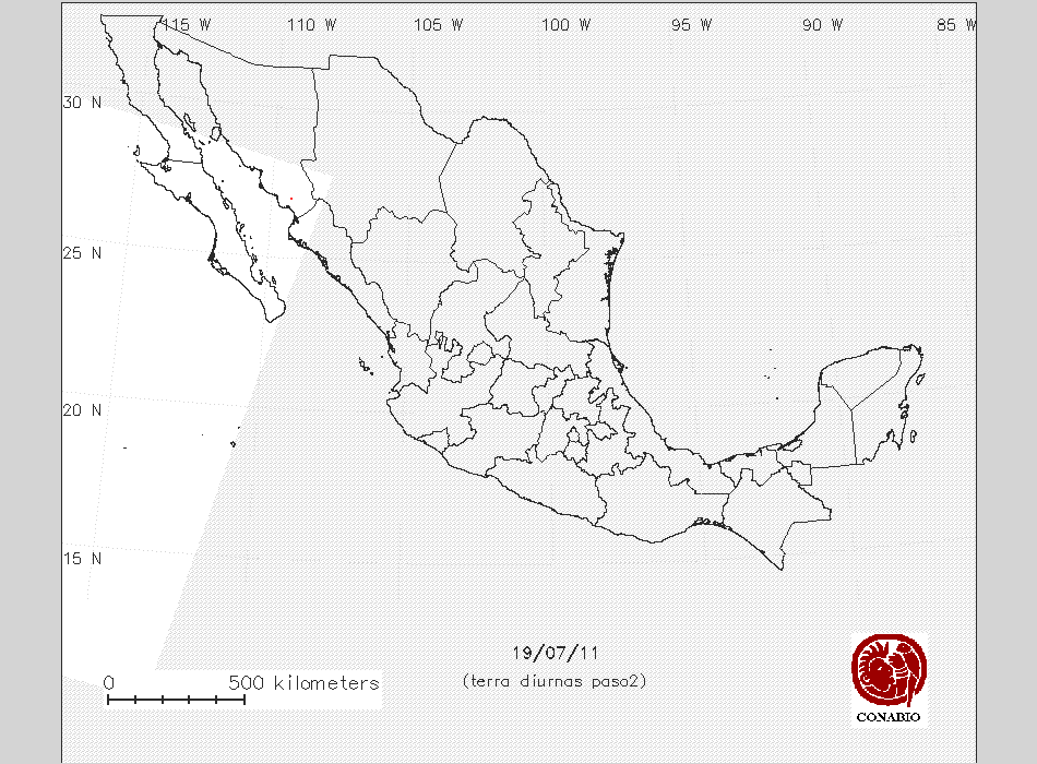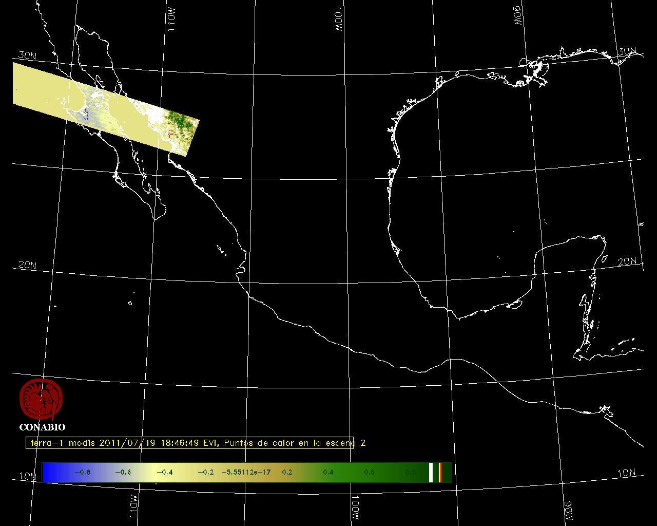 Se considera como punto de calor al elemento espacial mínimo de la imagen (pixel) que reporta una temperatura elevada. Para las imágenes diurnas la temperatura mínima considera es de 42 C y para las imágenes nocturnas es de 25 C. |