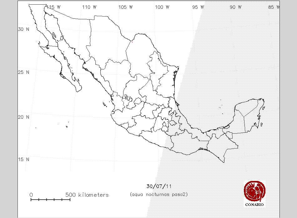 Se considera como punto de calor al elemento espacial mínimo de la imagen (pixel) que reporta una temperatura elevada. Para las imágenes diurnas la temperatura mínima considera es de 42 C y para las imágenes nocturnas es de 25 C. |