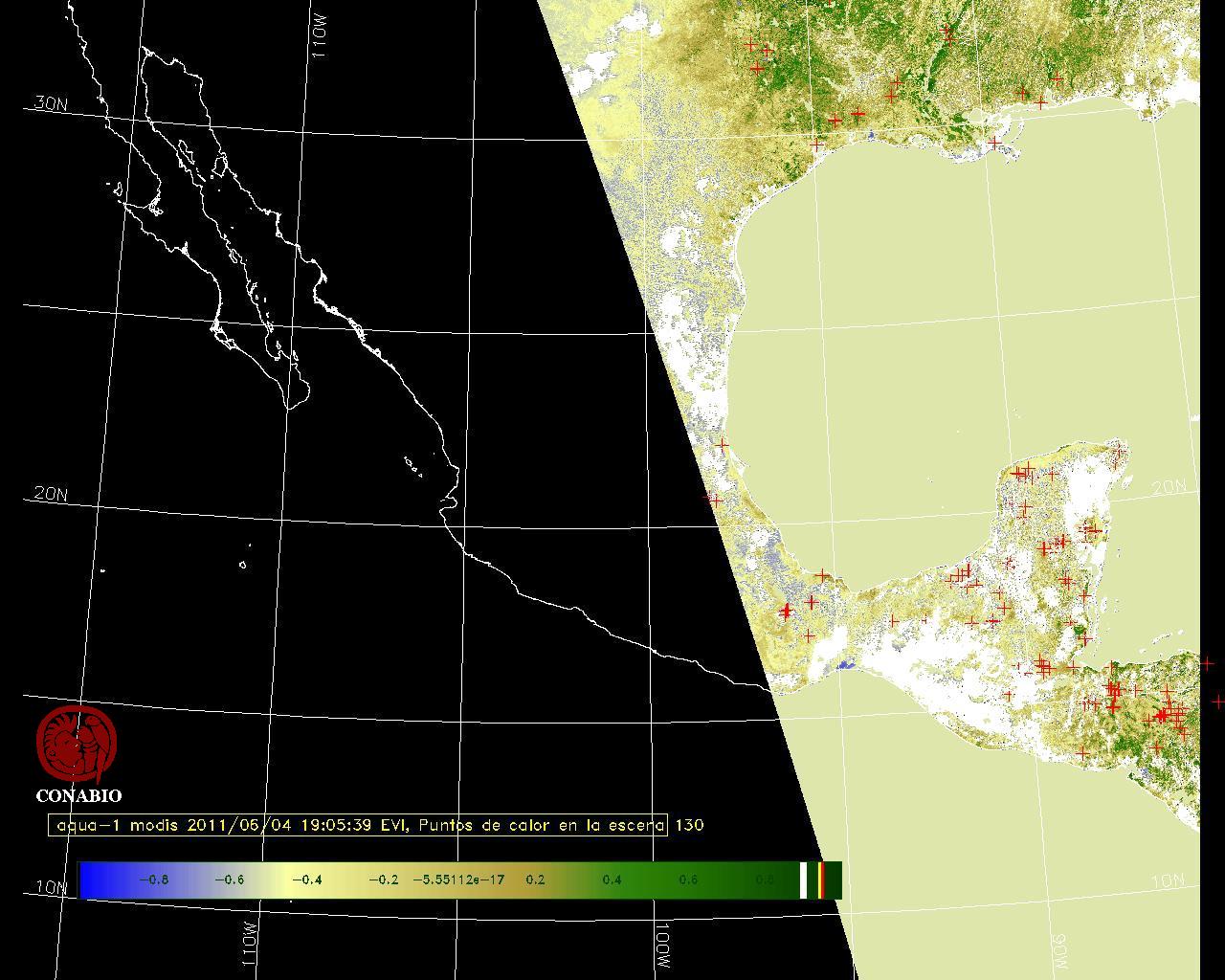 Se considera como punto de calor al elemento espacial mínimo de la imagen (pixel) que reporta una temperatura elevada. Para las imágenes diurnas la temperatura mínima considera es de 42 C y para las imágenes nocturnas es de 25 C. |