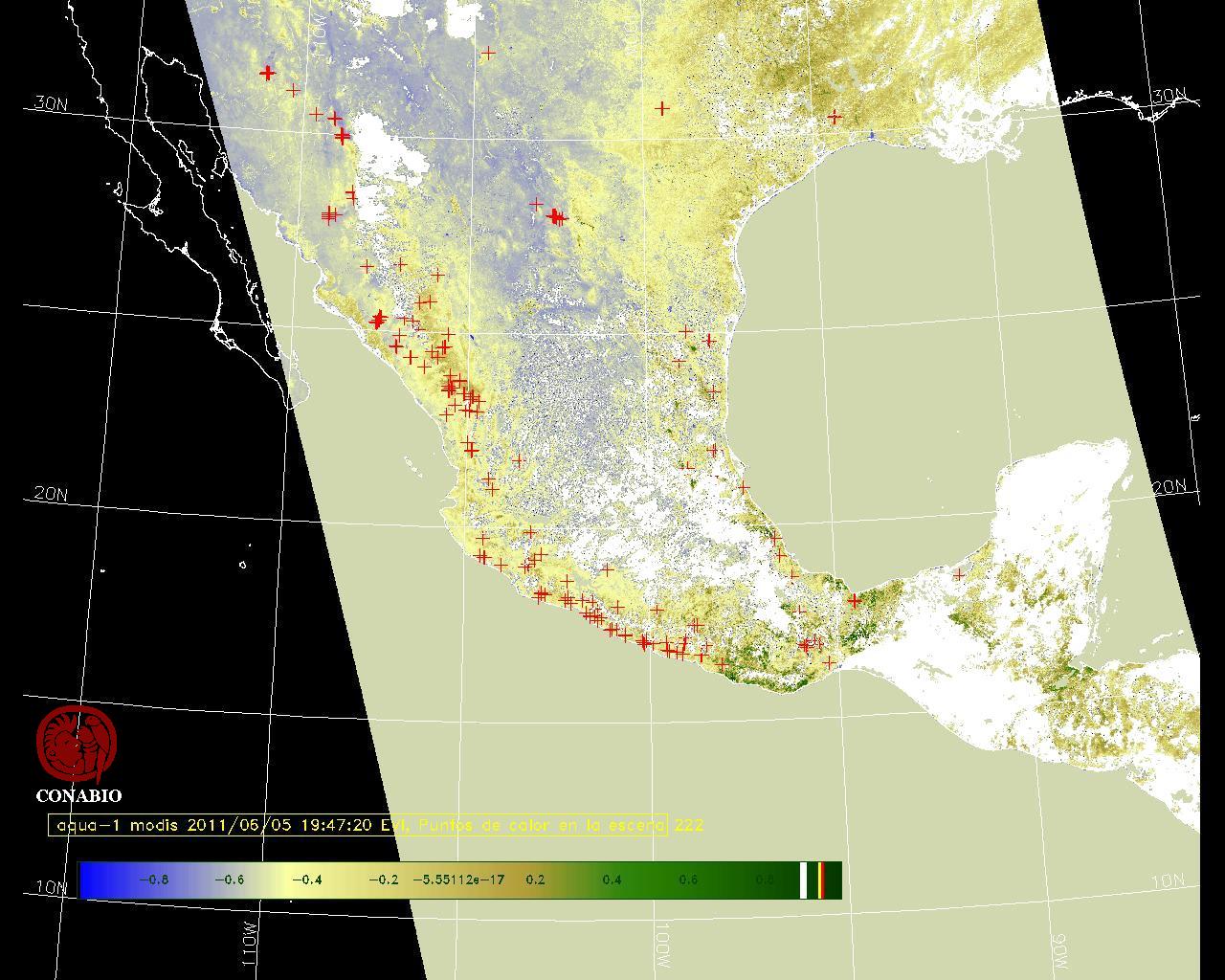 Se considera como punto de calor al elemento espacial mínimo de la imagen (pixel) que reporta una temperatura elevada. Para las imágenes diurnas la temperatura mínima considera es de 42 C y para las imágenes nocturnas es de 25 C. |