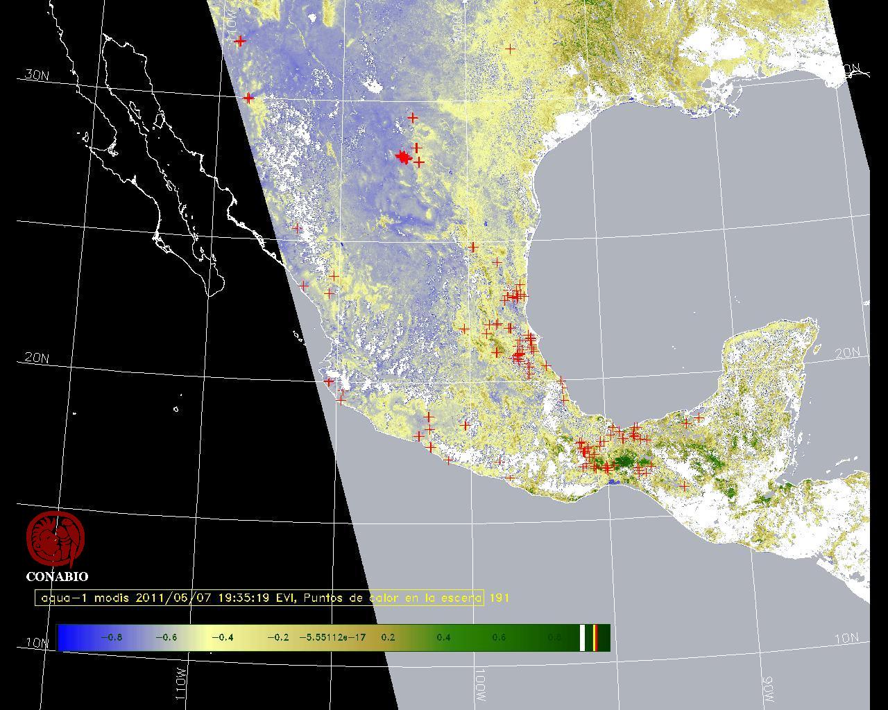 Se considera como punto de calor al elemento espacial mínimo de la imagen (pixel) que reporta una temperatura elevada. Para las imágenes diurnas la temperatura mínima considera es de 42 C y para las imágenes nocturnas es de 25 C. |