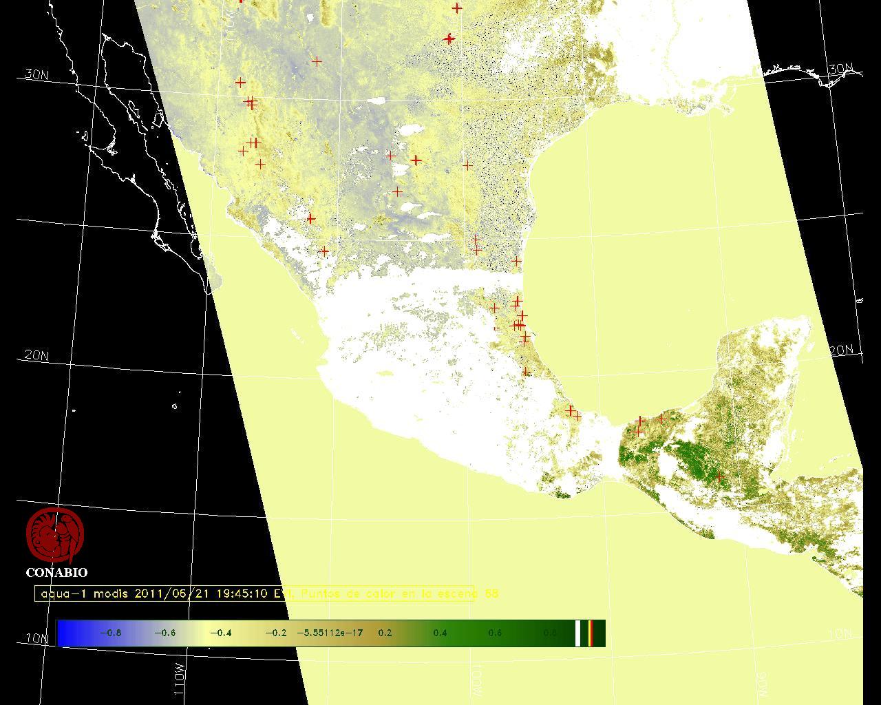 Se considera como punto de calor al elemento espacial mínimo de la imagen (pixel) que reporta una temperatura elevada. Para las imágenes diurnas la temperatura mínima considera es de 42 C y para las imágenes nocturnas es de 25 C. |