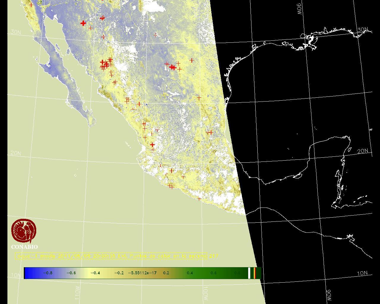 Se considera como punto de calor al elemento espacial mínimo de la imagen (pixel) que reporta una temperatura elevada. Para las imágenes diurnas la temperatura mínima considera es de 42 C y para las imágenes nocturnas es de 25 C. |