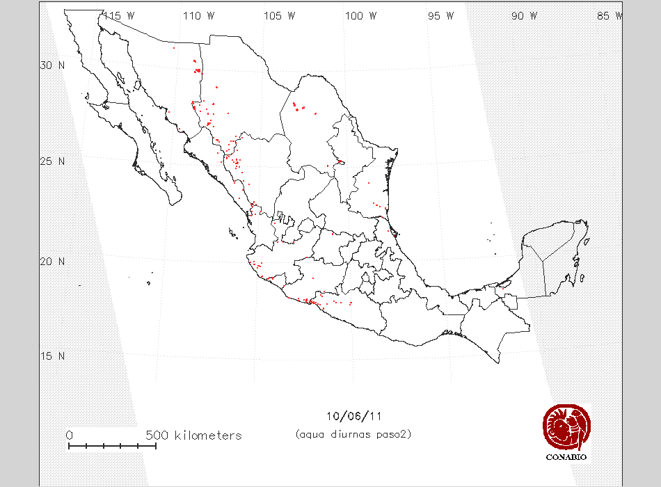Se considera como punto de calor al elemento espacial mínimo de la imagen (pixel) que reporta una temperatura elevada. Para las imágenes diurnas la temperatura mínima considera es de 42 C y para las imágenes nocturnas es de 25 C. |
