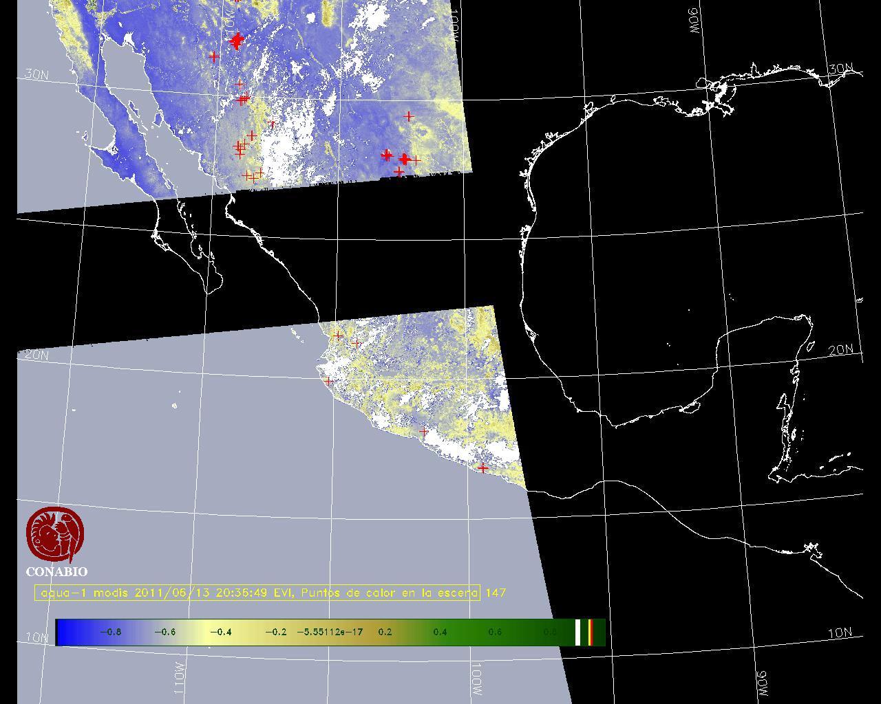 Se considera como punto de calor al elemento espacial mínimo de la imagen (pixel) que reporta una temperatura elevada. Para las imágenes diurnas la temperatura mínima considera es de 42 C y para las imágenes nocturnas es de 25 C. |
