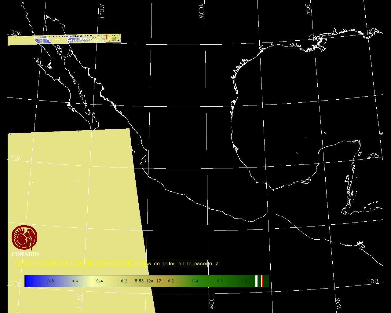 Se considera como punto de calor al elemento espacial mínimo de la imagen (pixel) que reporta una temperatura elevada. Para las imágenes diurnas la temperatura mínima considera es de 42 C y para las imágenes nocturnas es de 25 C. |