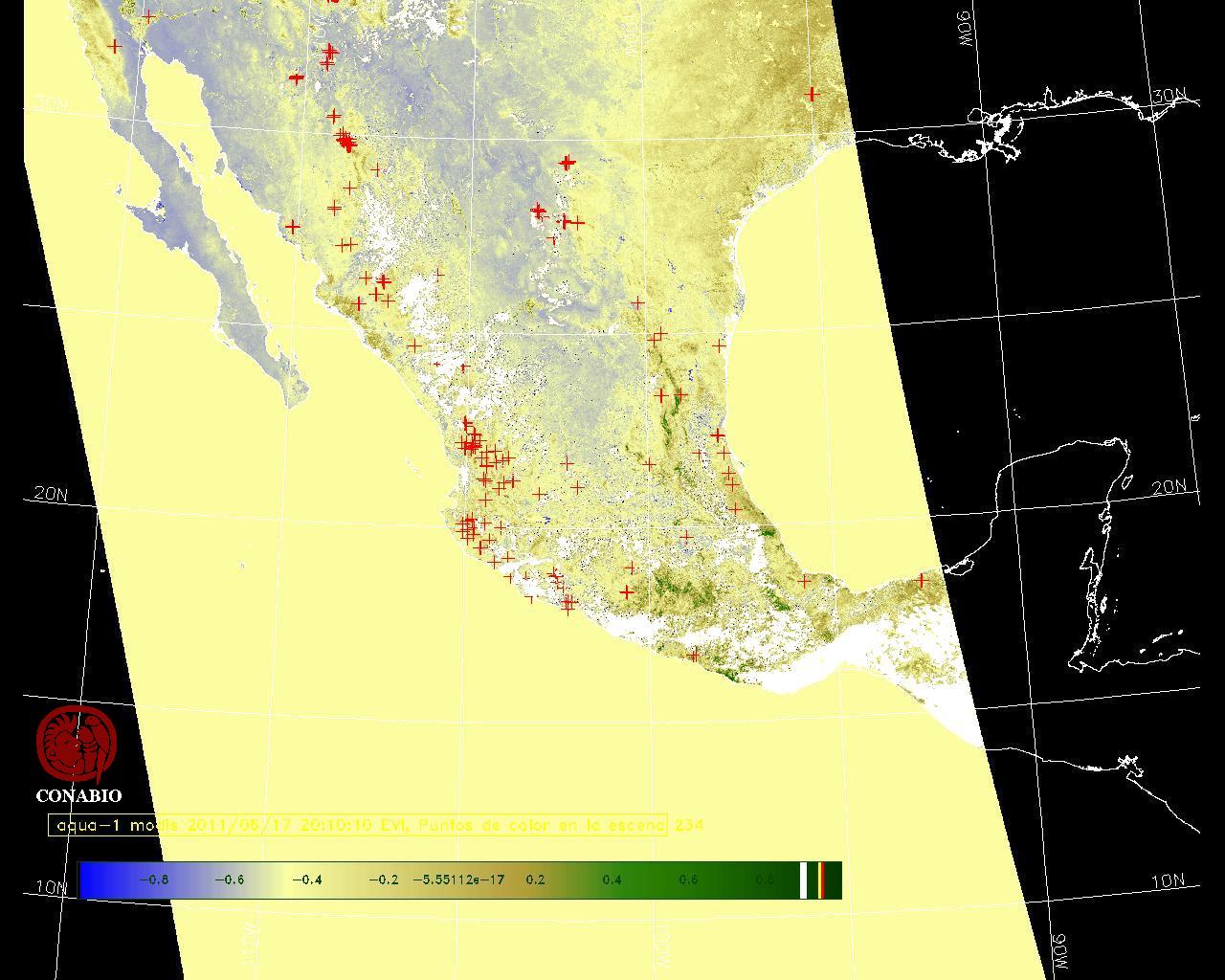 Se considera como punto de calor al elemento espacial mínimo de la imagen (pixel) que reporta una temperatura elevada. Para las imágenes diurnas la temperatura mínima considera es de 42 C y para las imágenes nocturnas es de 25 C. |