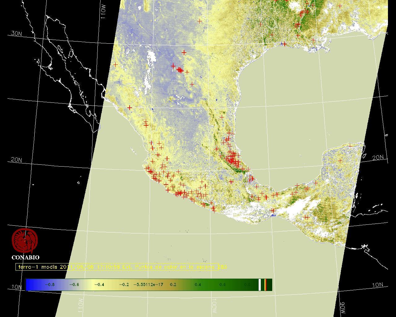 Se considera como punto de calor al elemento espacial mínimo de la imagen (pixel) que reporta una temperatura elevada. Para las imágenes diurnas la temperatura mínima considera es de 42 C y para las imágenes nocturnas es de 25 C. |