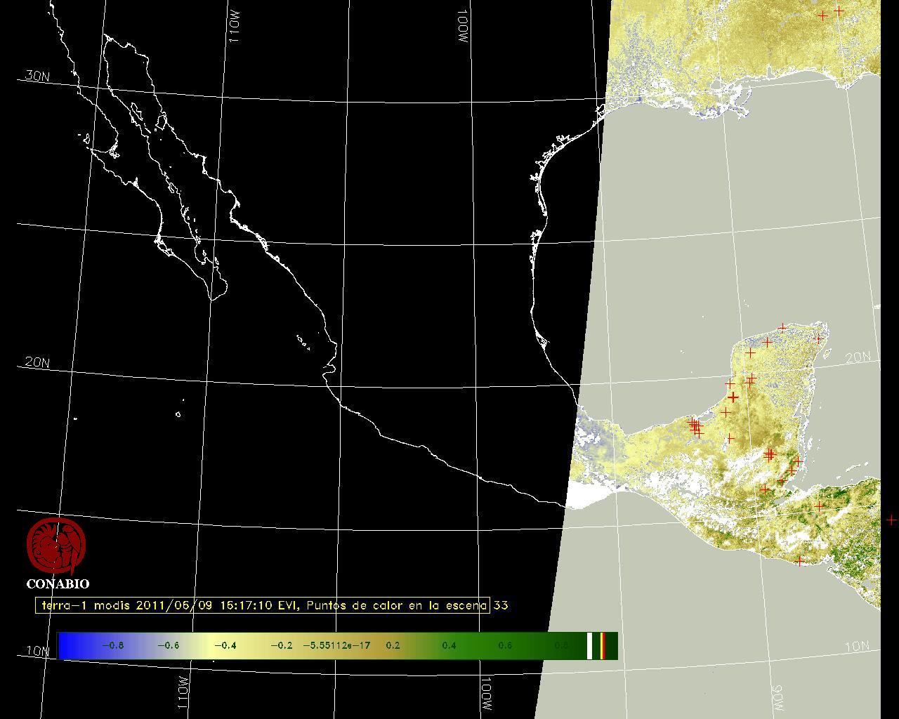 Se considera como punto de calor al elemento espacial mínimo de la imagen (pixel) que reporta una temperatura elevada. Para las imágenes diurnas la temperatura mínima considera es de 42 C y para las imágenes nocturnas es de 25 C. |