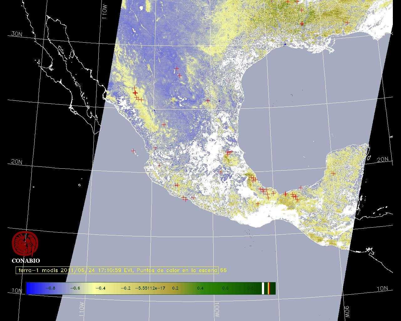 Se considera como punto de calor al elemento espacial mínimo de la imagen (pixel) que reporta una temperatura elevada. Para las imágenes diurnas la temperatura mínima considera es de 42 C y para las imágenes nocturnas es de 25 C. |