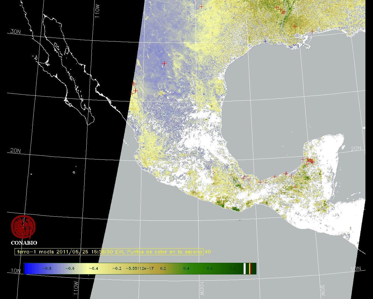 Se considera como punto de calor al elemento espacial mínimo de la imagen (pixel) que reporta una temperatura elevada. Para las imágenes diurnas la temperatura mínima considera es de 42 C y para las imágenes nocturnas es de 25 C. |