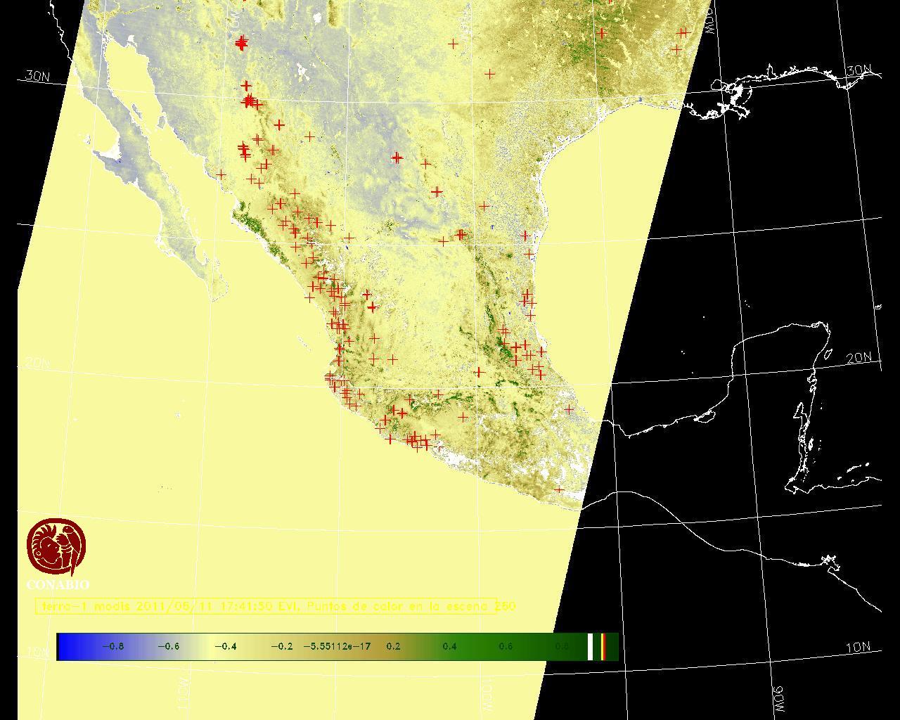 Se considera como punto de calor al elemento espacial mínimo de la imagen (pixel) que reporta una temperatura elevada. Para las imágenes diurnas la temperatura mínima considera es de 42 C y para las imágenes nocturnas es de 25 C. |