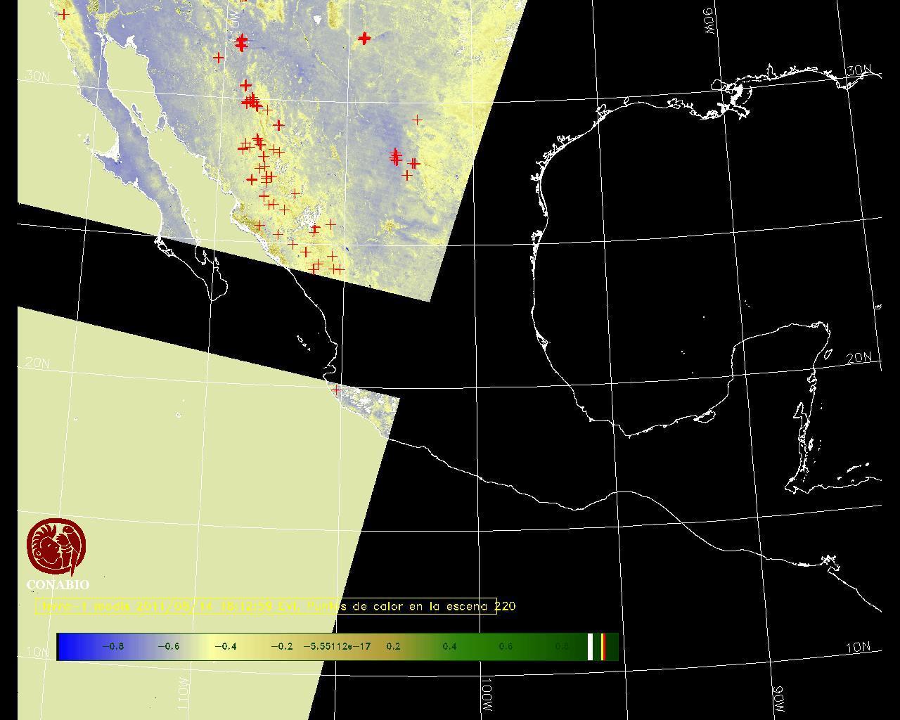 Se considera como punto de calor al elemento espacial mínimo de la imagen (pixel) que reporta una temperatura elevada. Para las imágenes diurnas la temperatura mínima considera es de 42 C y para las imágenes nocturnas es de 25 C. |
